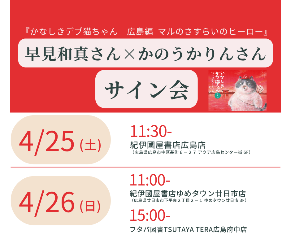 【4/25(土)サイン会】早見和真さん×かのうかりんさんサイン会開催 『かなしきデブ猫ちゃん 広島編』出版記念イベント